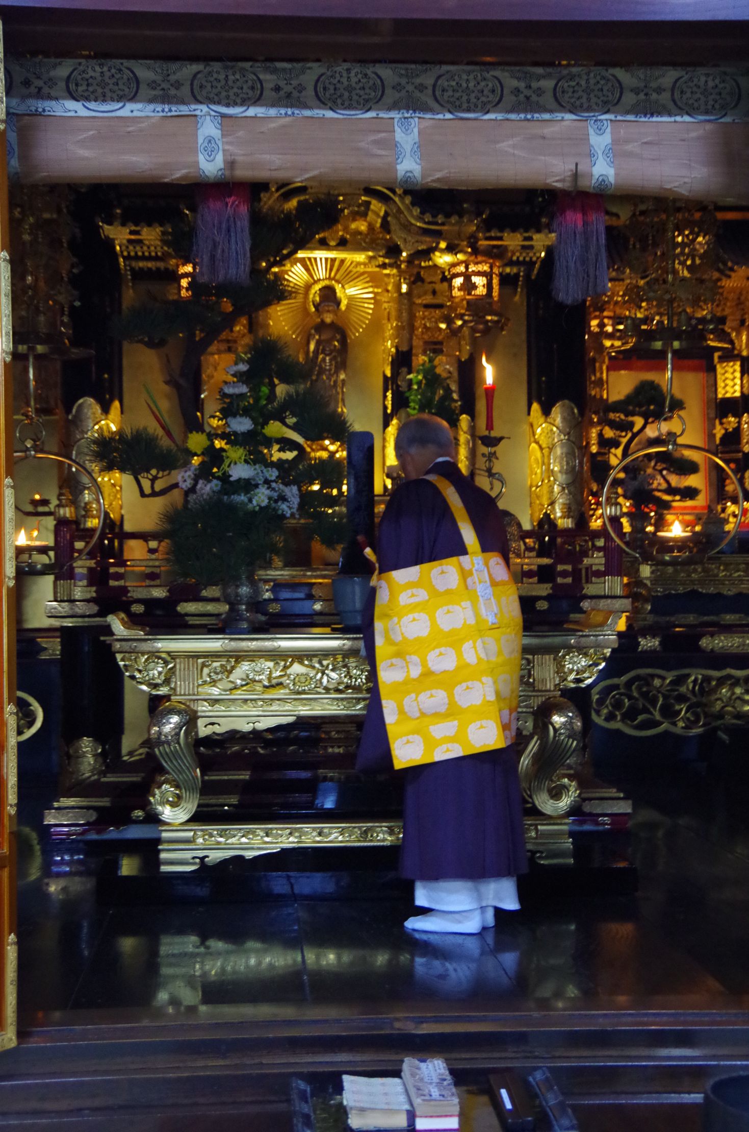 a previous chief priest, Takayuki SUGAWARA, in front of a Buddhist shrine at the Shoumyou-Ji temple
