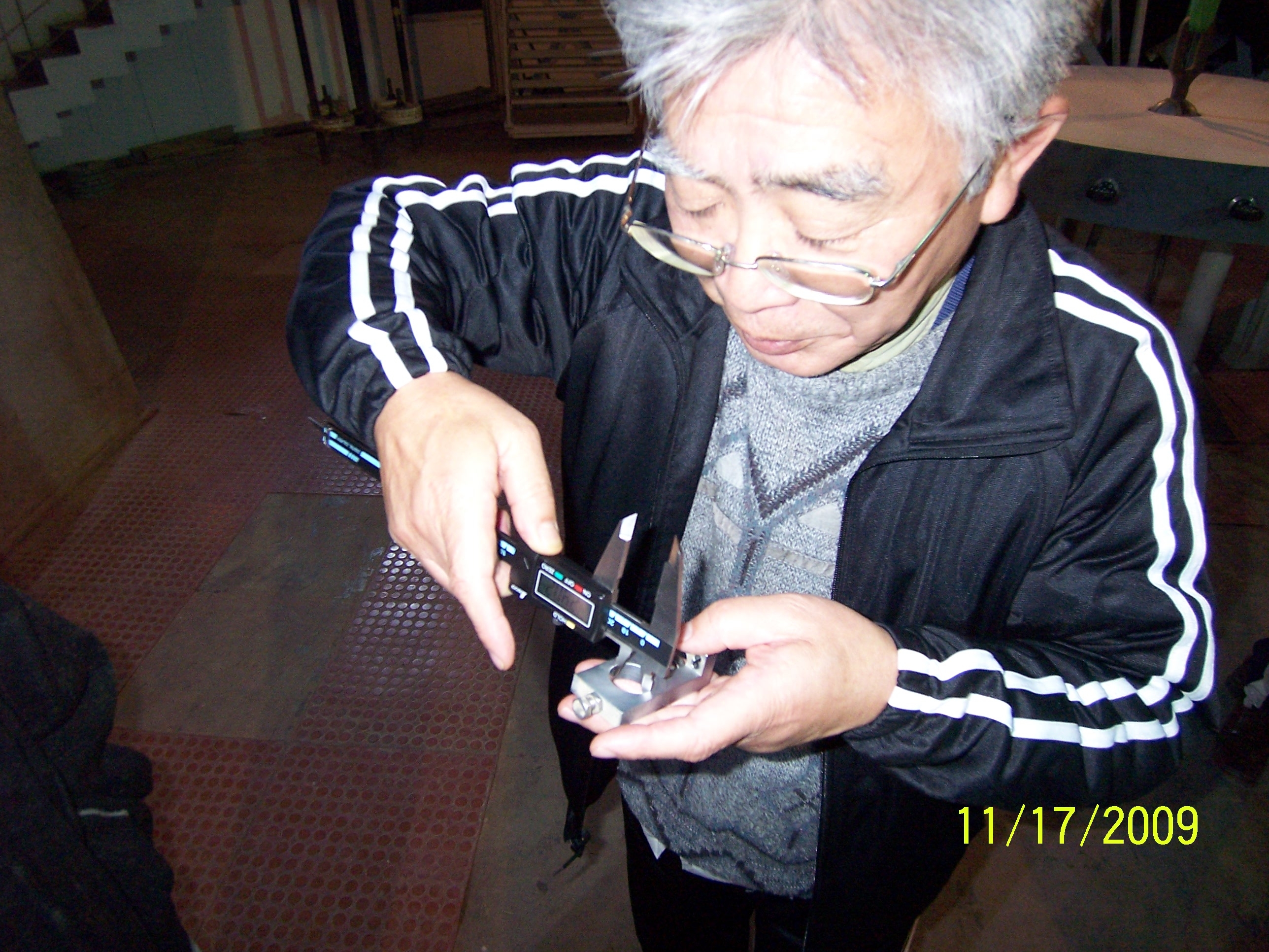 改造した主鏡アクシャルサポート部品を計測中の野口さん