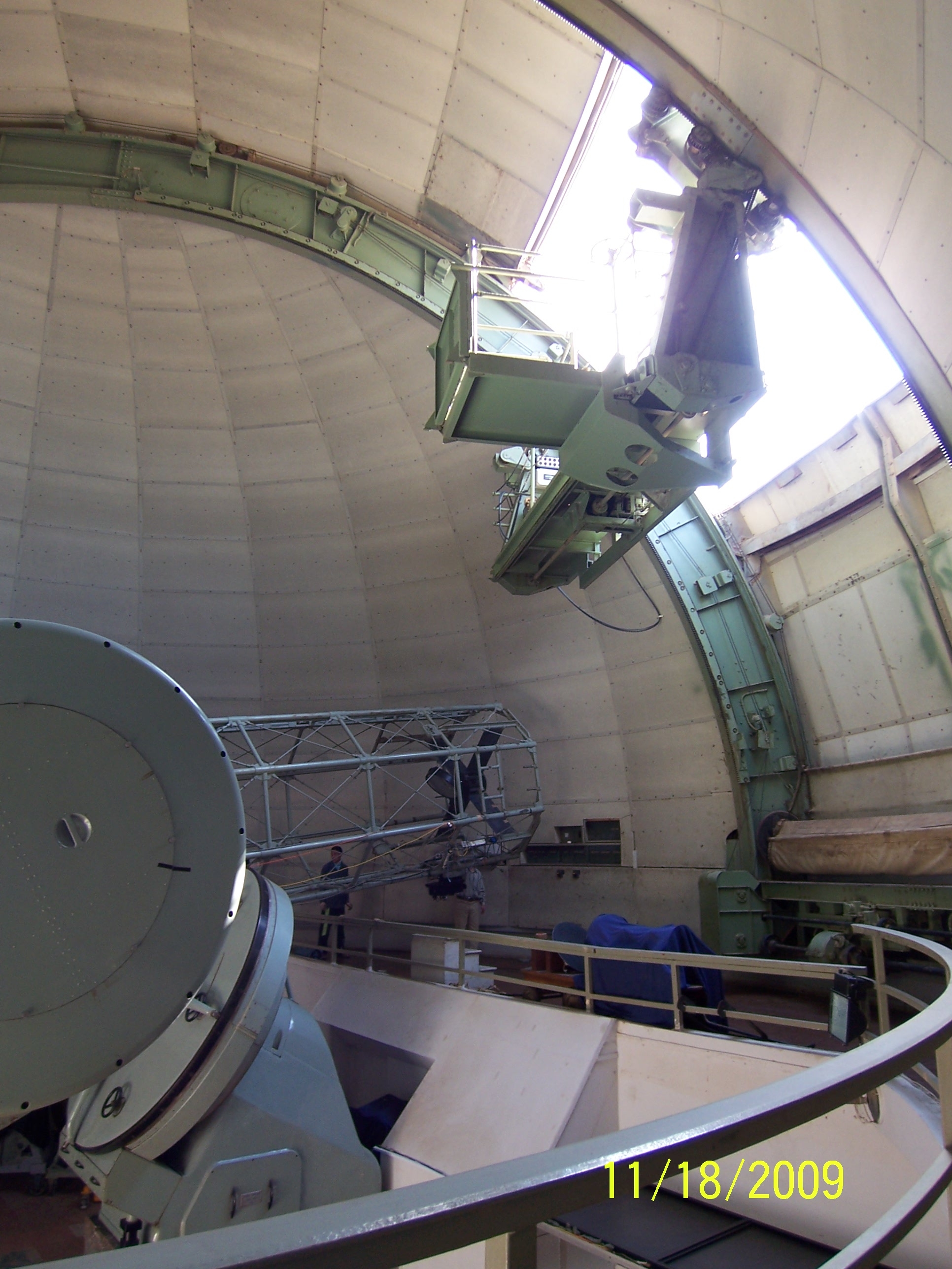 望遠鏡ニュートン副鏡を観測台車(上にある物)で吊り下げてはずします