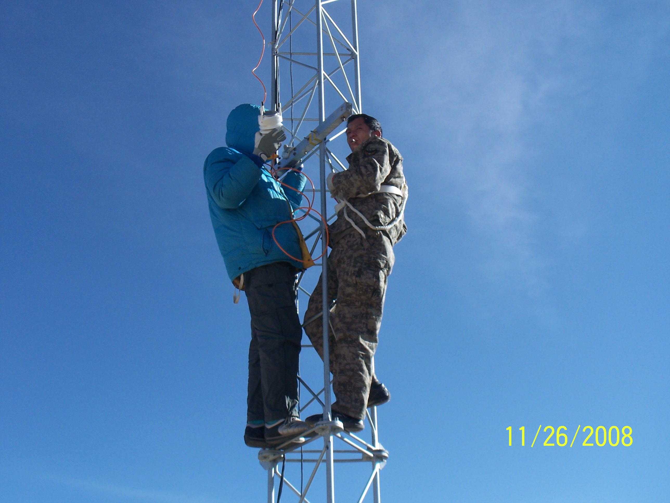 Mr. Oshima collaborating Mr. Yu to try to install weather station WXT510 on one of stays at Karasu-B