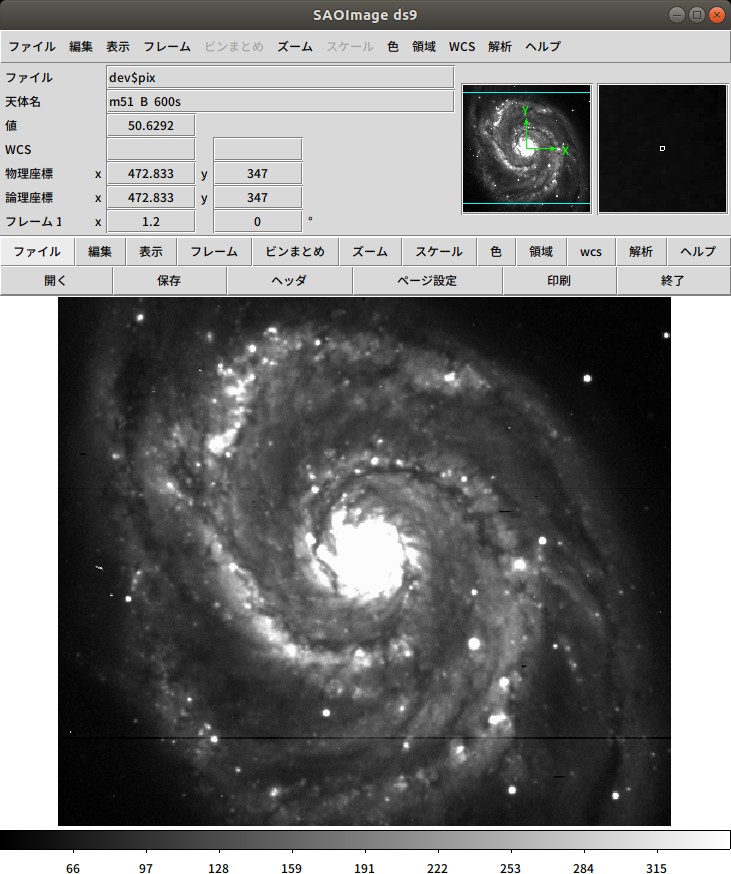 | --> display dev$pix 1 ==> ○Display on ds9 OK!!! But Headers are NG. --> !xpaset -p ds9 fits /mnt/diskB/00SiteSurveyData/00SiteSurveyData/000_A40M_Images_Analysed/03_Ali/2013/201301/20130101A/20130101AWMMs/CM2_Gar20130101235824CWMMs.fits ==> ○Display on ds9 OK!!! and ○Headers are also OK. --> import pyds9 --> d = pyds9.DS9() --> d.set("file /mnt/diskB/00SiteSurveyData/00SiteSurveyData/000_A40M_Images_Analysed/03_Ali/2013/201301/20130101A/20130101AWMMs/CM2_Gar20130101235824CWMMs.fits") ==> ○Display on ds9 OK!!! and ○Headers are also OK. |